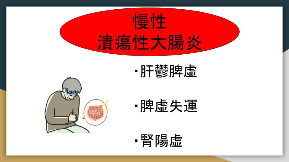 そのため、潰瘍性大腸炎と一口に言っても急性期は大腸湿熱が多く、活動期または寛解期は肝鬱脾虚や脾虚失運となり、慢性期には腎陽虚となるのが一般的です。